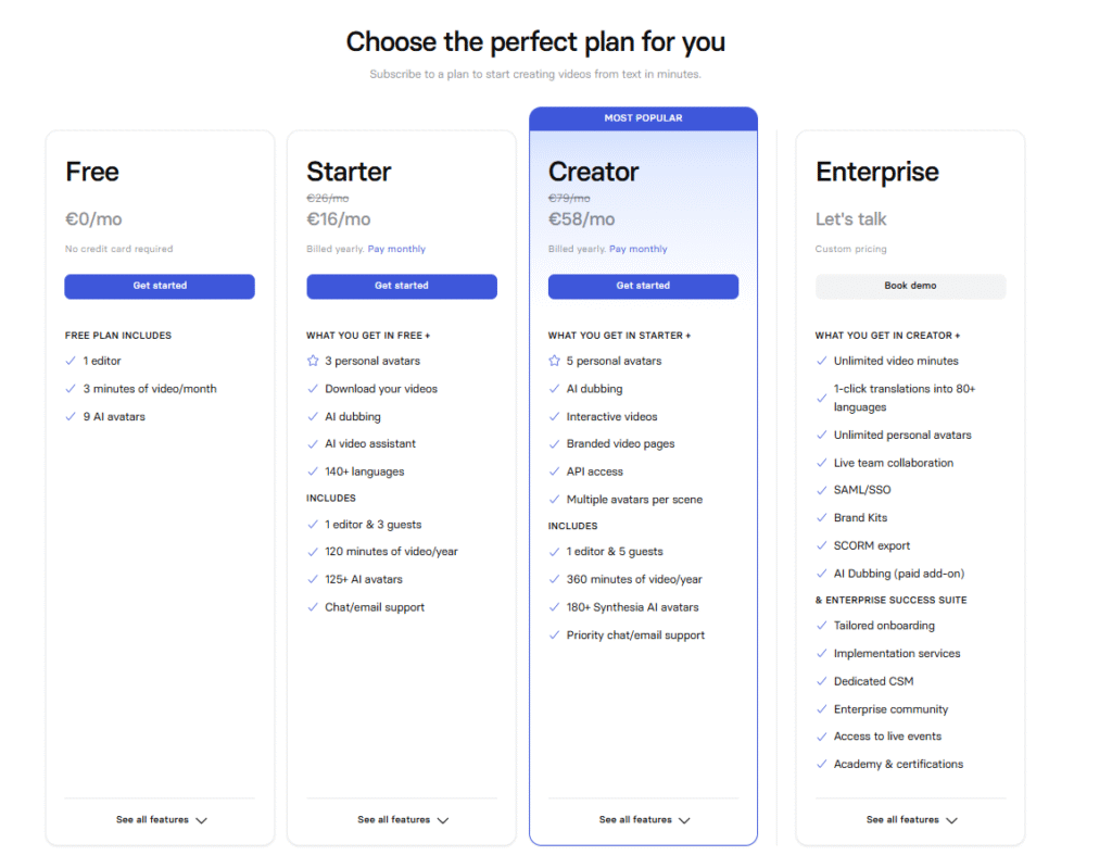 Aucune de ces alternatives ne coûte aussi cher que Synthesia Creator (67$/mois) — toutes offrent plus de flexibilité pour les créateurs indépendants.