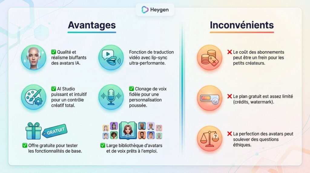 Limites de la version gratuite : filigrane et restrictions sur la durée, et parfois des exports limités. Le rendu reste dépendant de la qualité du script (phrases trop longues = lèvres moins naturelles).
